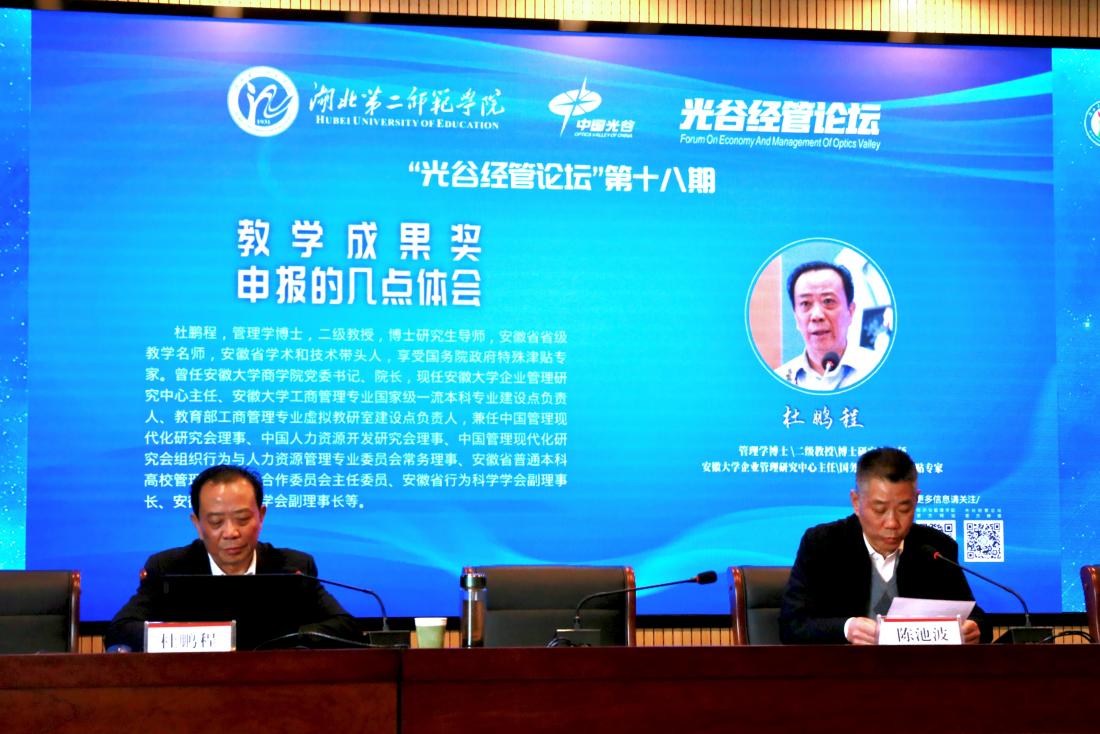 本网讯(通讯员 傅睿哲)为进一步加强学科专业建设,提升教学研究水平,推进教学成果转化,3月18日下午,经济与管理学院特邀安徽大学商学院原院长杜鹏程教授作“教学成果奖申报的体会”专题报告。报告会由陈池波院长主持。
