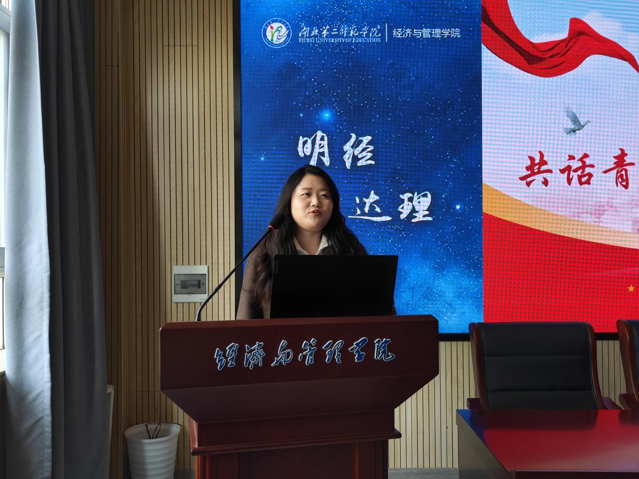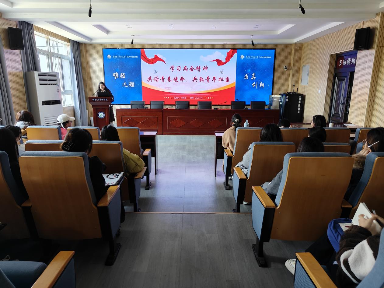 本网讯(见习记者 魏雪晴)3月18日中午,经济与管理学院(以下简称“经管院”)分党校于2号楼三楼多功能报告厅开展发展对象培训班“学习两会精神,共话青春使命,共叙青年担当”主题课程,全体分党校发展对象参加,经管院学生第三党支部书记徐梅馨担任主讲人。