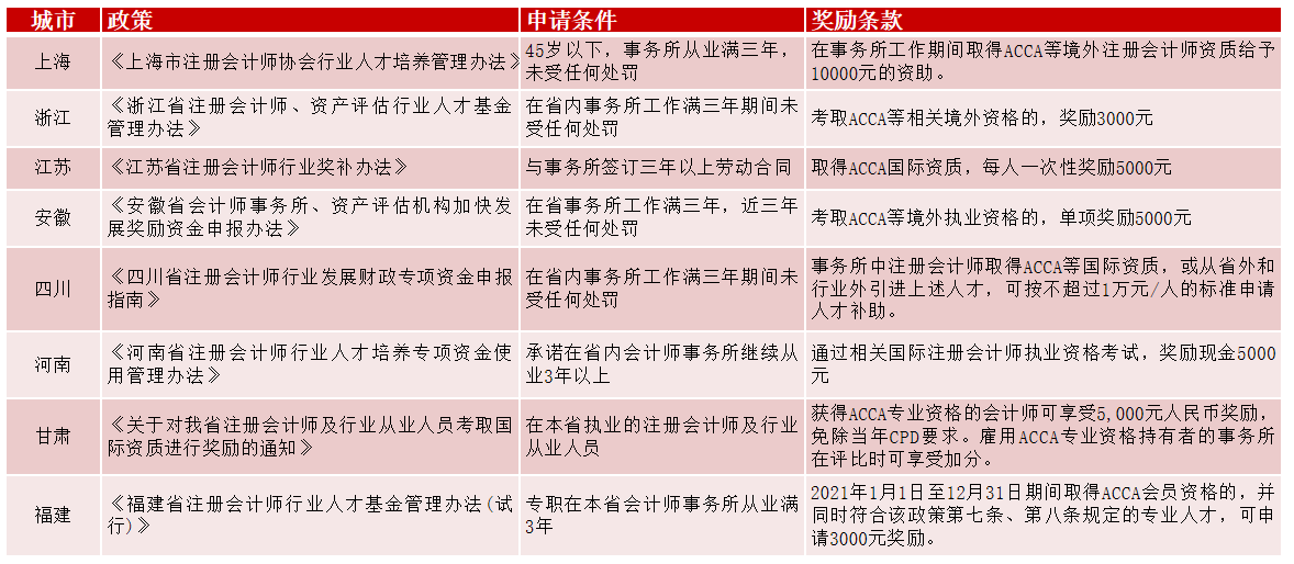 地方注协对ACCA人才的奖励政策