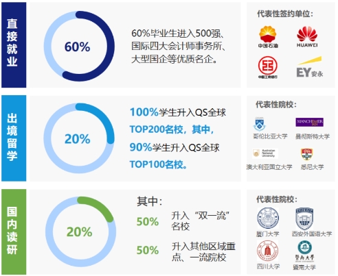 据兄弟院校ACCA实验班毕业生去向统计,ACCA实验班学生出国留学、国内考研和直接就业的比例约为20%:20%:60%,上述指标均优于普通财务管理专业毕业生,也明显优于其他文科专业毕业生。