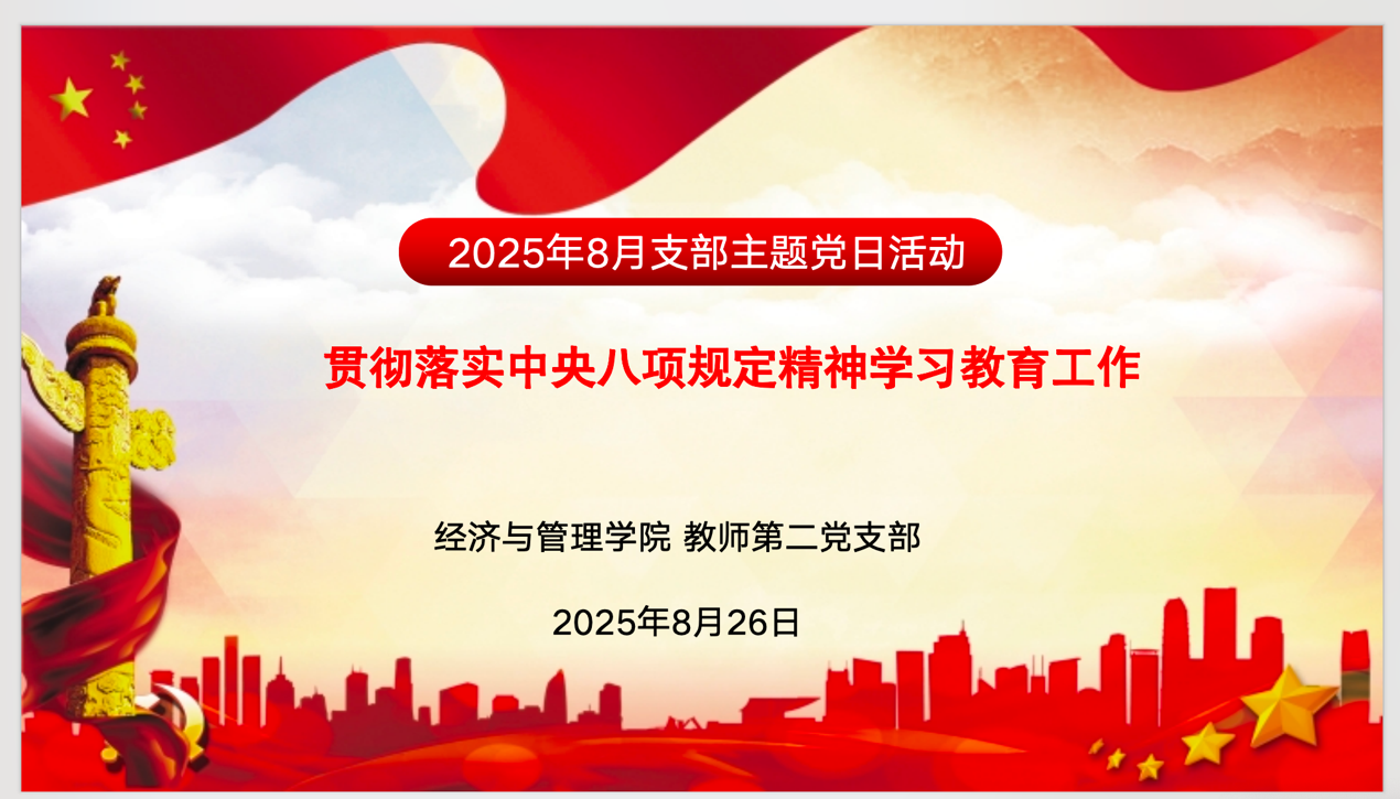 本网讯(通讯员 王迪)2025年8月26日,教师第二支部召开“贯彻落实中央八项规定精神学习教育工作”主题党日活动,深入贯彻落实中央八项规定精神,持续加强支部党员纪律作风建设。活动由党支部书记赵学彧同志主持并领学,教师第二支部全体党员参加学习。