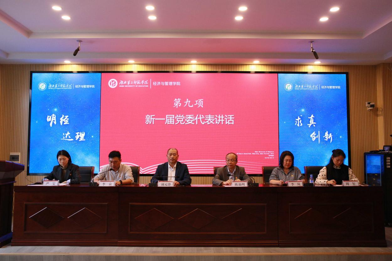 经济与管理学院副院长陈艳明向大会作党费收缴、使用和管理情况的报告,并经会议审议通过。大会按照规定程序,选举产生了新一届经济与管理学院党委委员,刘元锋、李京、李岚、陈艳明、严雯、周玺、常静当选为新一届党委委员。大会休会期间,学院新一届党委委员会召开了第一次全体委员会议,选举刘元锋为党委书记、李京为党委副书记。全委会明确了其他委员分工:陈艳明为纪检委员、李岚为统战委员、常静为宣传委员、严雯为组织委员、周玺为青年委员。