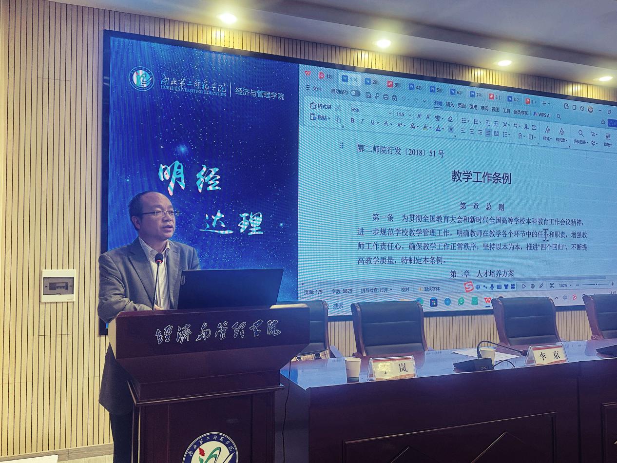 陈艳明副院长系统领学解读了《教学工作条例》《教学事故认定及处理办法》《教师任教任课规范》等八项核心教学规章制度。他结合典型案例,重点阐述了课堂教学、作业批改、课程考核、教学纪律等方面的规范要求与“红线底线”,尤其对调停课程序、教学事故分类与后果、新教师任教资格等作了细致说明,提醒全体教师务必增强规范执教的“肌肉记忆”,杜绝教学过程中的失范行为。