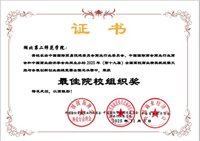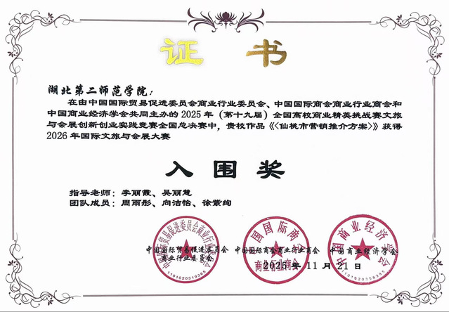 经过知识赛、校赛、省赛、国赛等层层选拔,由李丽霞和吴丽慧老师指导,周雨彤、徐紫绚和向洁怡团队完成的作品《仙桃市营销推介方案》表现突出,受邀参加11月22日至11月24日在浙江永康举行的2026(新加坡)国际商务活动策划大赛中国地区选拔赛暨第十九届全国高校商业精英挑战赛文旅与会展创新创业实践竞赛全国总决赛精英赛,并成功晋级 2026年(新加坡)国际商务会展策划大赛国际总决赛。