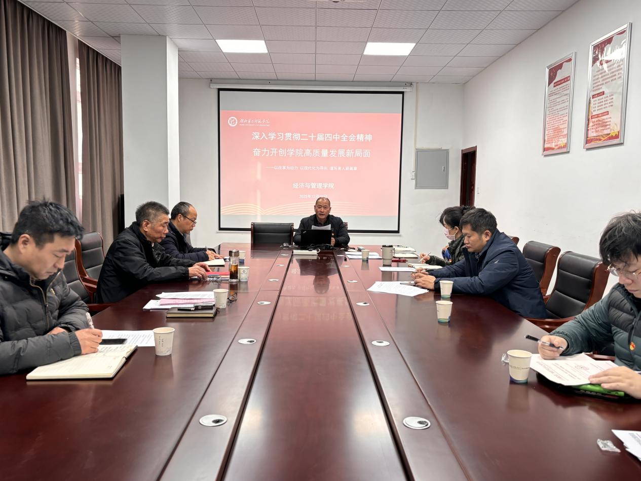经济与管理学院党委书记刘元锋以“深入学习贯彻党的二十届四中全会精神 奋力开创学院高质量发展新局面——以改革为动力 以现代化为导向 谱写育人新篇章”为题作宣讲报告,学院领导班子成员、各支部书记参加会议。