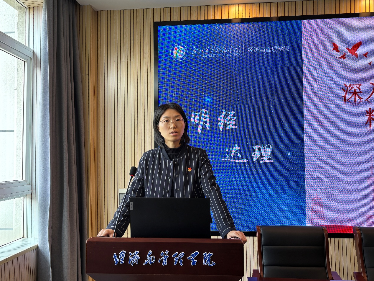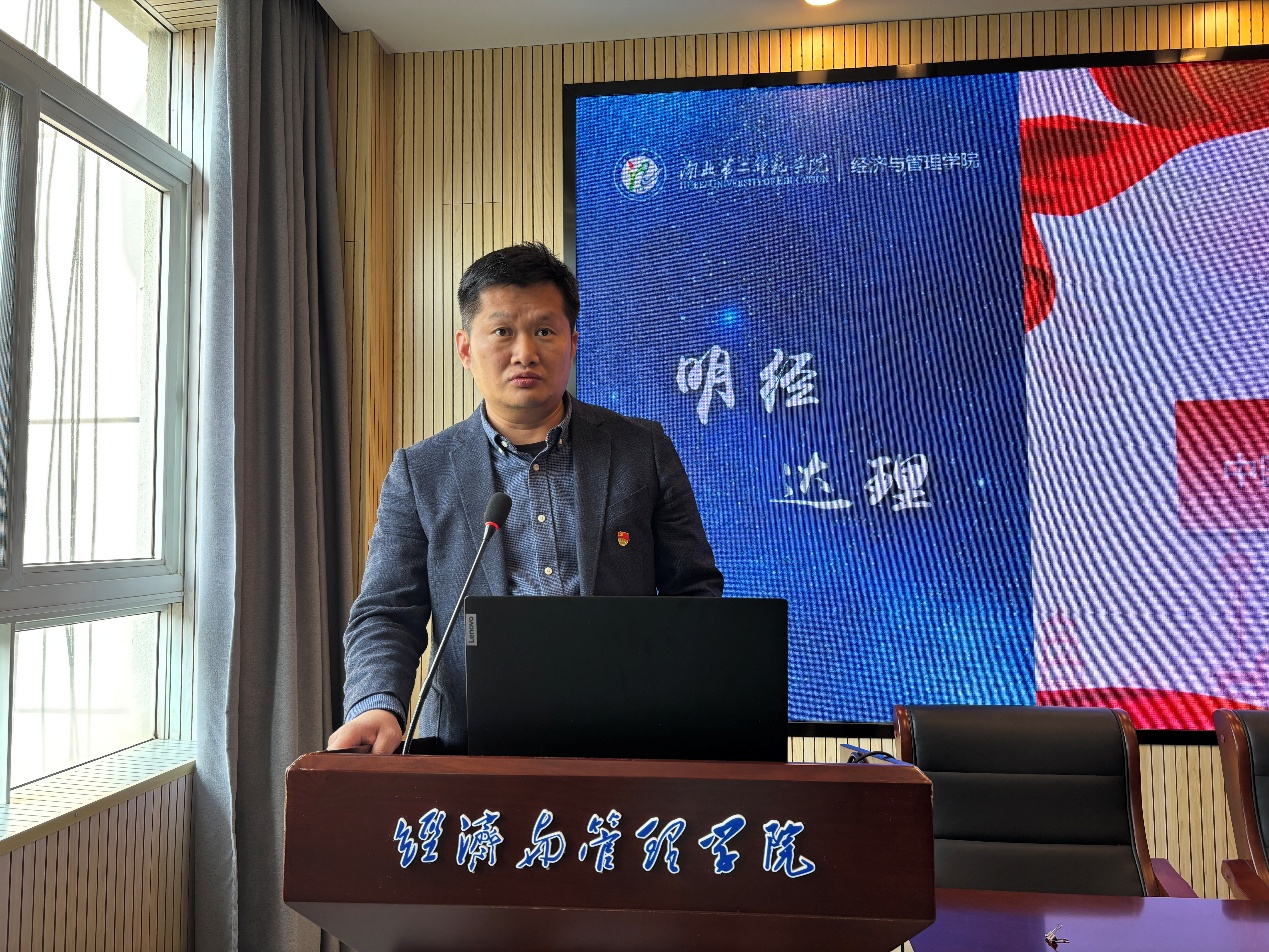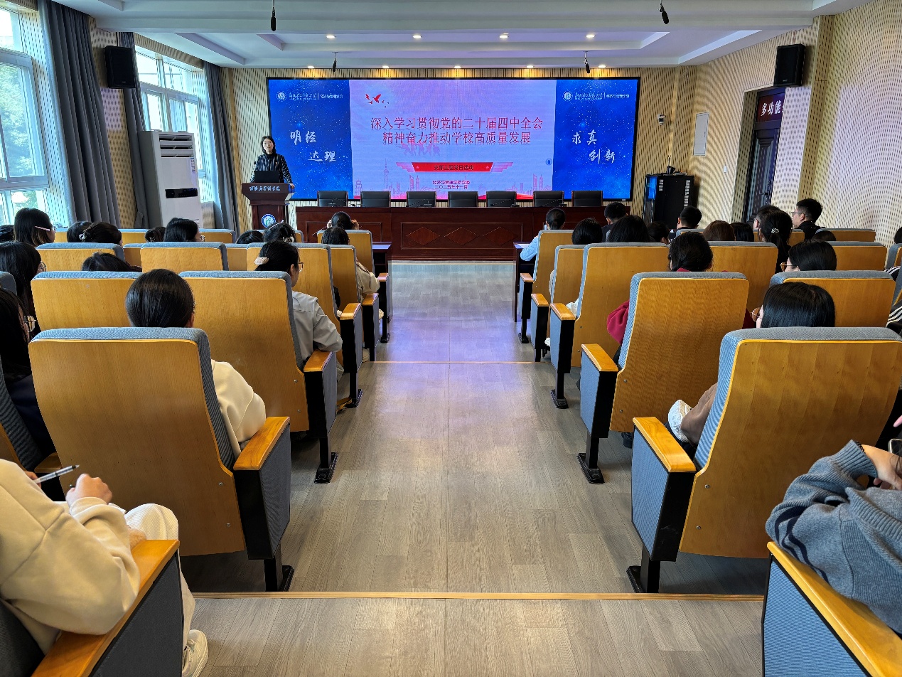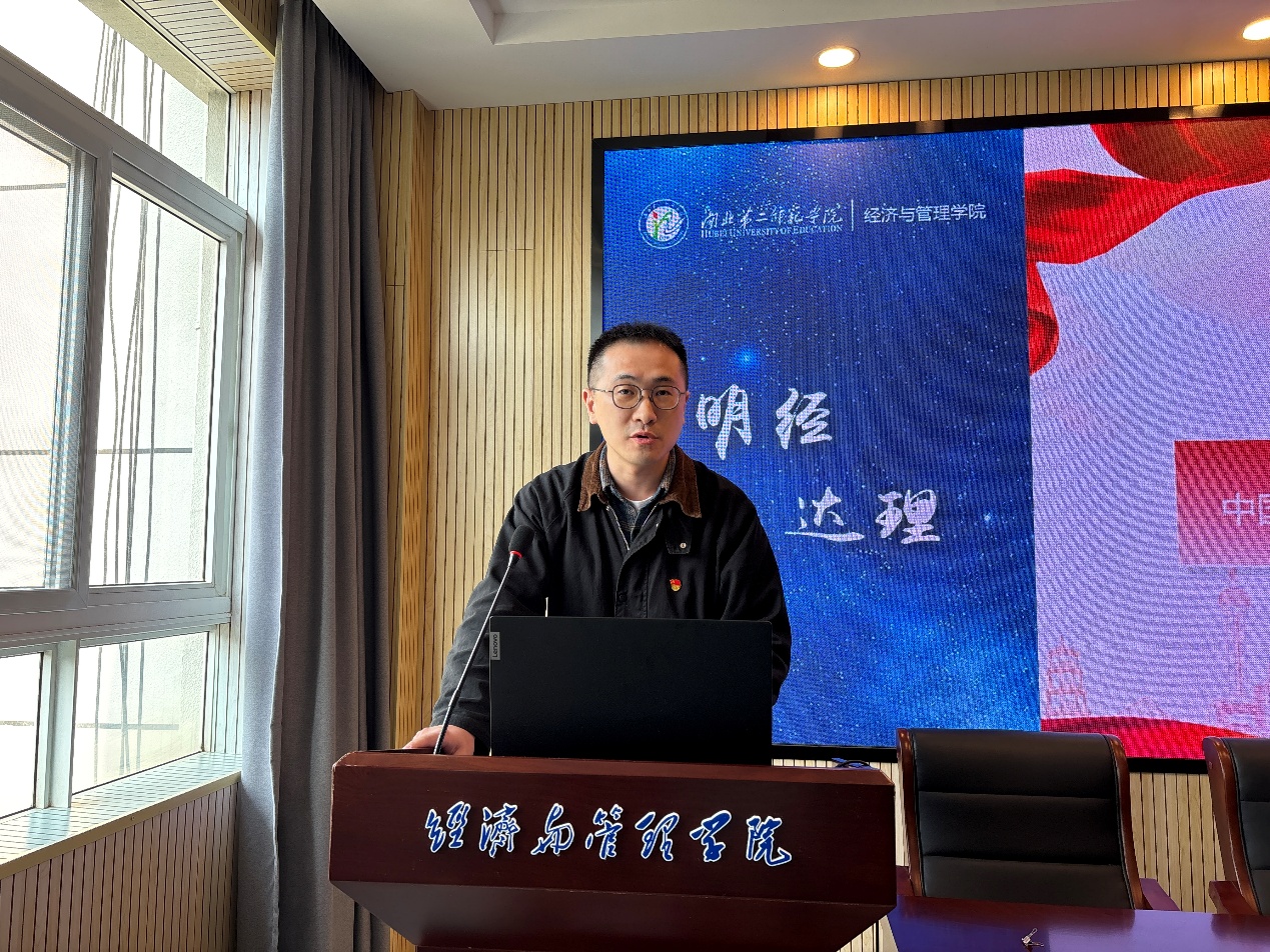 本网讯(通讯员 刘艾倾)11月14日中午,经济与管理学院学生党支部于2号楼三楼报告厅开展“深入学习贯彻党的二十届四中全会精神奋力推动学校高质量发展”主题党日活动。活动由学生第一党支部书记严雯主持,学生第二党支部书记张泉、学生第二党支部组织委员兼宣传委员姜炜、学生第三党支部纪检委员周慧东、袁博翀老师、董方宇老师出席,各支部全体党员参加。