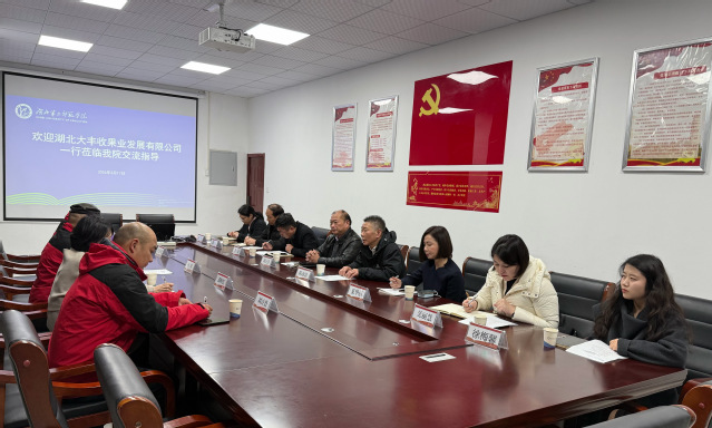 本网讯(通讯员 陈咏倩)为深入推进产教融合落地见效,紧扣乡村振兴战略部署、抢抓银发经济发展新机遇,助力地方特色农业产业提质增效,近日,经济与管理学院赴湖北大丰收果业发展有限公司开展实地调研暨产教融合专题交流会。3月17日上午,专题交流会正式召开,学院党委书记刘元锋、院长陈池波、党委副书记李京及教师代表参会,湖北大丰收果业发展有限公司董事长杨昕率企业代表出席会议,会议由刘元锋主持。双方围绕校企协同育人、产业赋能升级、服务地方发展等核心议题展开深度研讨,立足高校专业优势与企业产业需求,共谋校企共赢、产教融合新路径。