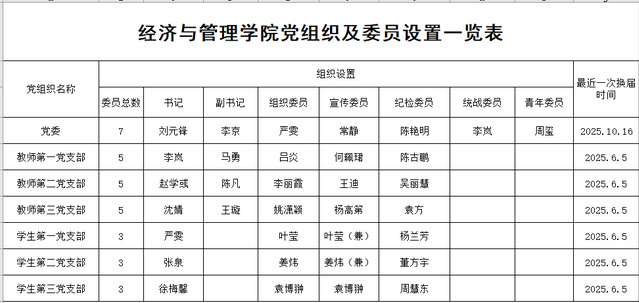 经济与管理学院党组织及委员设置