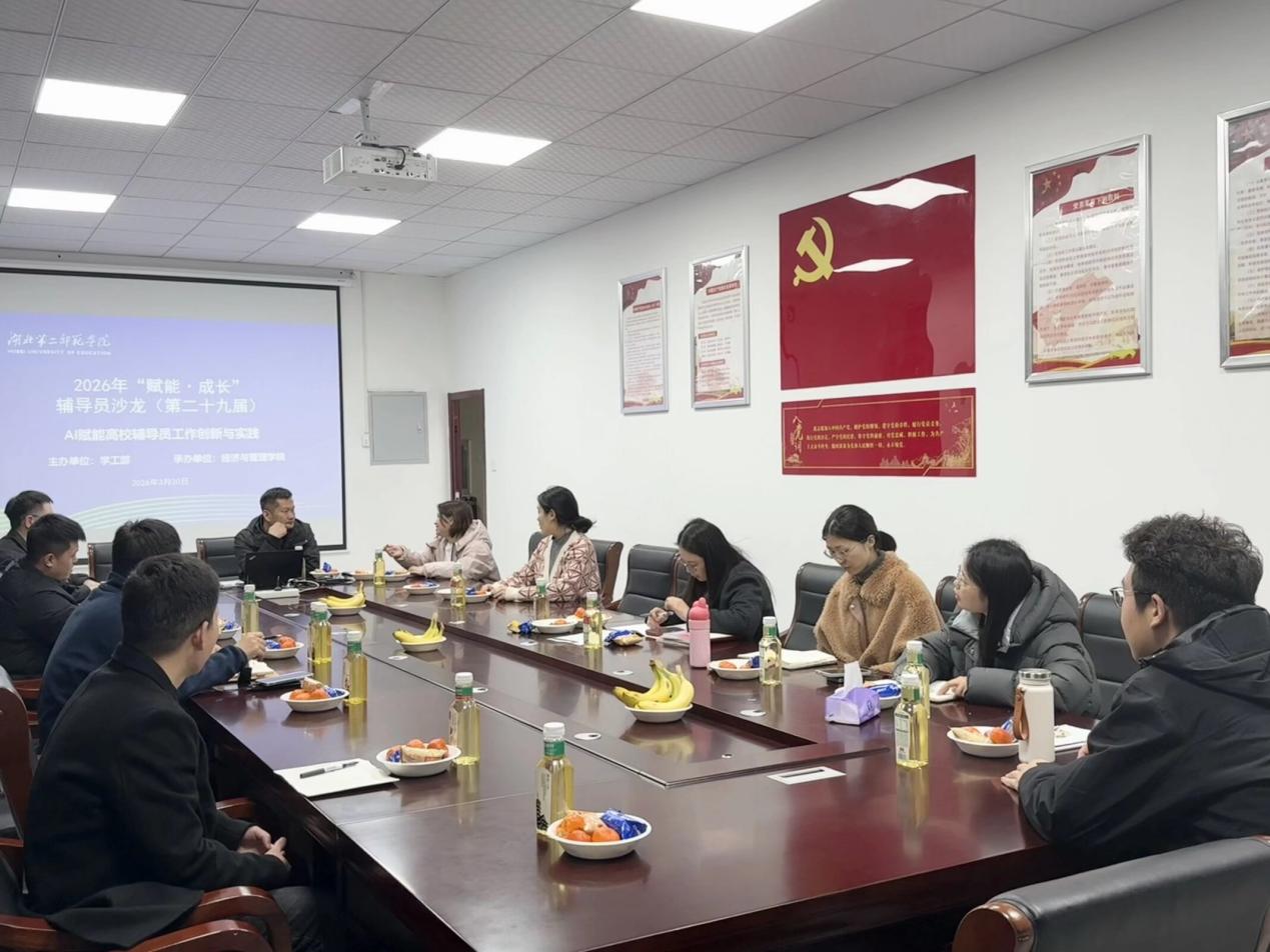 本网讯(通讯员 龚雅莉)为深入贯彻落实新时代高校思想政治工作新部署新要求,积极探索人工智能赋能辅导员工作的创新路径与实践模式,不断提升育人工作质效,3月20日下午,2026年第二十九期“赋能・成长”辅导员沙龙活动在学院二号楼五楼会议室顺利举办。经济与管理学院全体辅导员代表参加本次活动,活动由学工办主任周慧东主持。