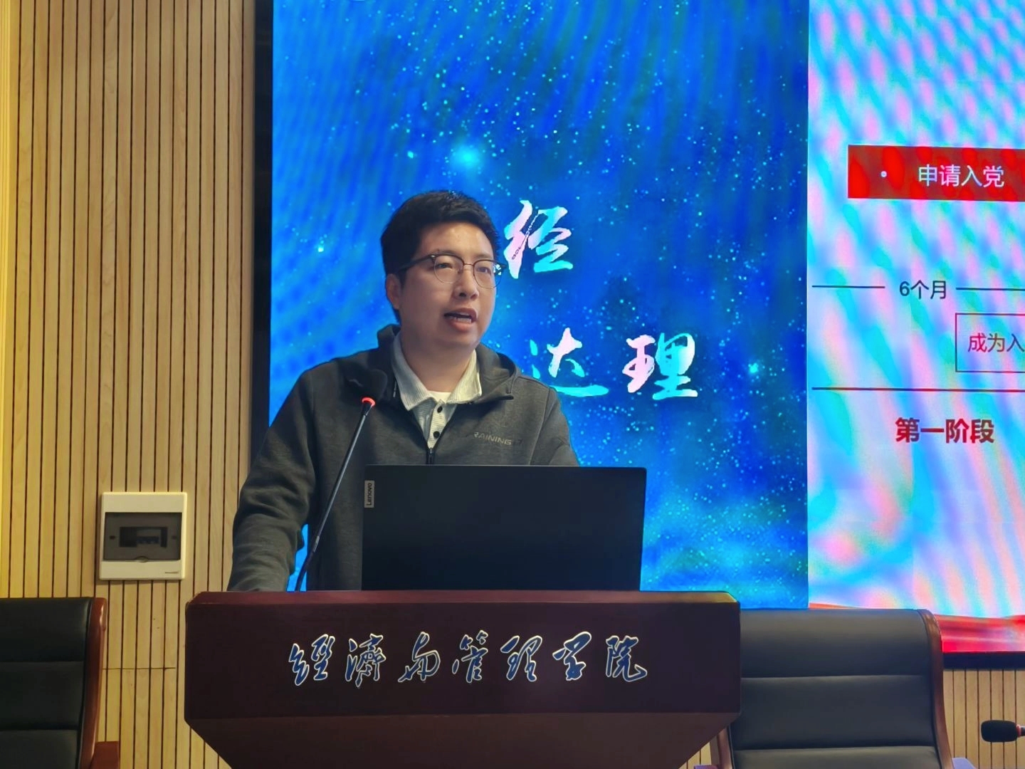 本网讯(通讯员 李旭亿)3月24日晚,经济与管理学院“分享入党心得,共促青年奋进”师友学友分享活动在二号楼三楼报告厅举行。经管院团委负责人袁博翀和优秀学生党员吴悠然共同参与此次活动,25级国际经济与贸易1班叶恩囝担任主持人。