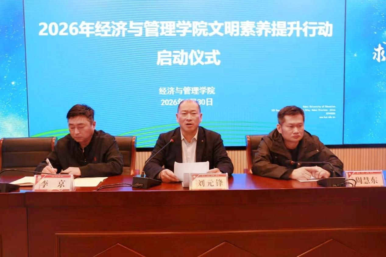 本网讯(通讯员 陈咏倩)3月30日中午,经济与管理学院在二号楼三楼报告厅举办文明素养提升行动启动仪式。经济与管理学院党委书记刘元锋,党委副书记李京,学工办主任周慧东出席仪式,全体辅导员及学生代表参加本次活动。仪式由25级国际经济与贸易1班刘宇主持。