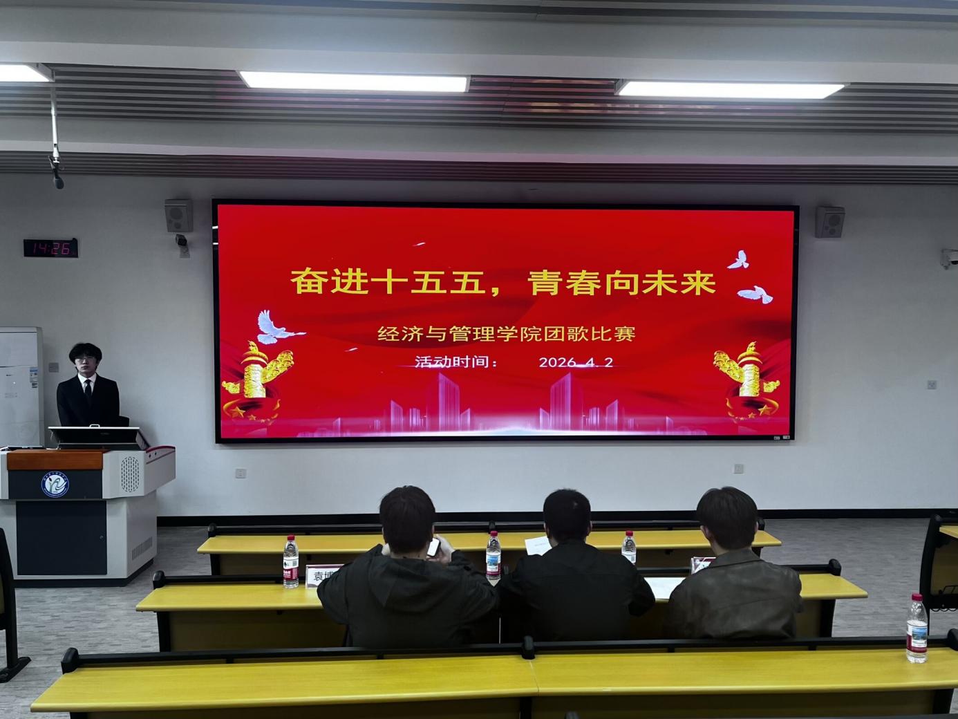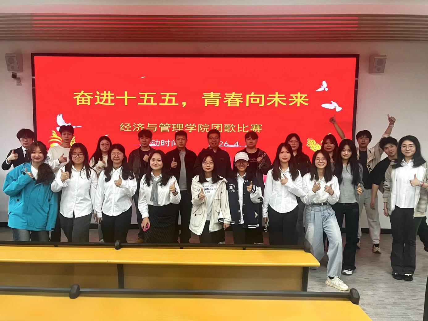 本网讯(通讯员 明铃铃)为深入学习贯彻党的二十大精神,激励青年学子传承五四精神、厚植家国情怀,在中国式现代化建设中挺膺担当,4月2日中午,湖北第二师范学院经济与管理学院于博雅楼 521 成功举办 “团歌耀五四,青春正当时” 团歌合唱比赛。学生会指导老师袁博翀、董方宇,学生会主席团成员向洁怡及分团委学生副书记刘羽丰、熊基担任评委,25 级会计学 2 班王棋正主持赛事,12 个班级代表队同台竞演,尽显经管学子青春风采。