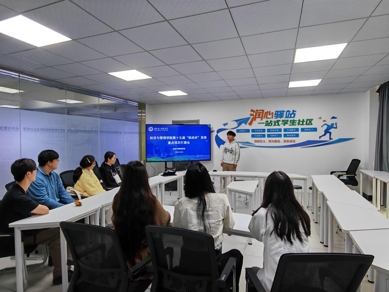 本网讯(通讯员 彭钰娟)为深入推进“挑战杯”竞赛备赛工作,切实提升参赛作品质量,充分发挥一站式学生社区育人功能,搭建学科竞赛指导优质平台,4月6日晚,经济与管理学院召开“挑战杯”重点项目打磨会。会议由学科竞赛工作指导老师叶莹主持,邀请武汉专创融合科技研究院院长高泽金莅临指导,晋级校赛的四支队伍全员参与,精准对接备赛需求,破解作品打磨难题。