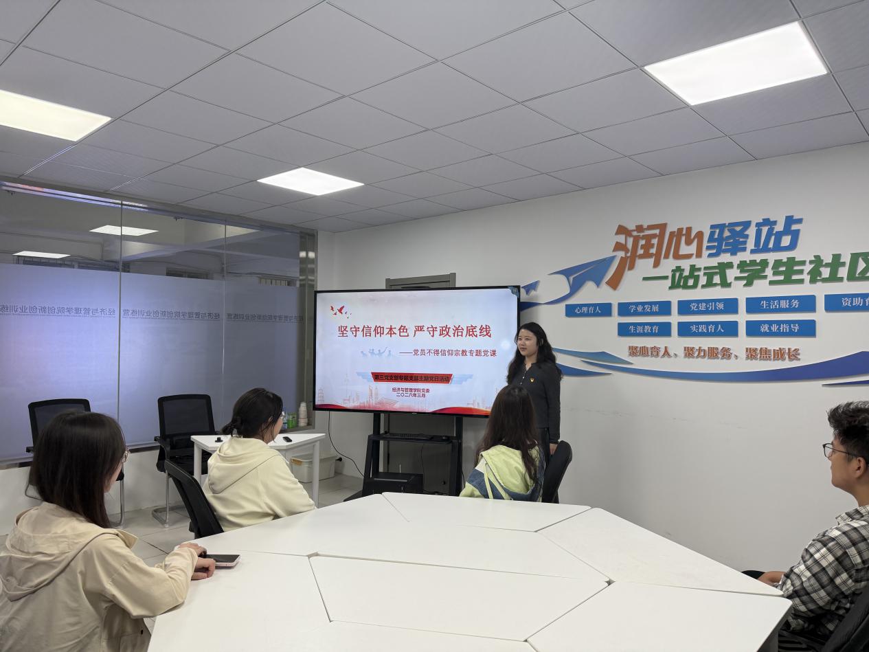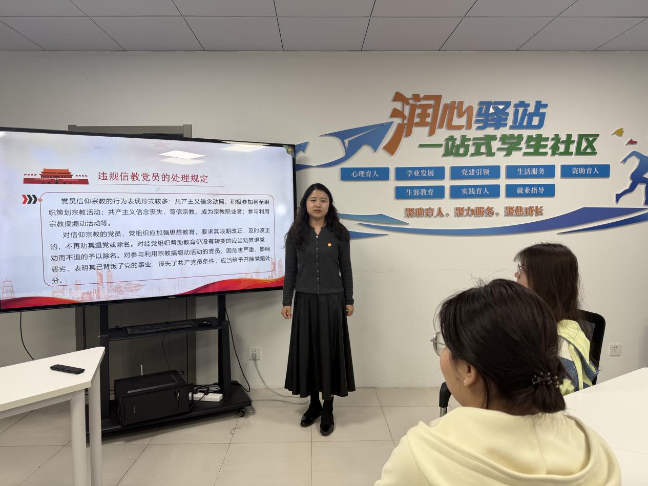 活动伊始,全体党员起立奏唱《中华人民共和国国歌》,庄严的旋律凝聚起奋进力量;在领誓人带领下,全体党员面向鲜红党旗,举起右拳重温入党誓词,铮铮誓言铿锵有力,进一步坚定了理想信念、强化了责任担当,让每一位党员接受了一次深刻的党性洗礼和思想淬炼。随后,徐梅馨围绕活动主题讲授专题党课,结合高校学生党员的学习生活实际和成长发展需求,系统阐释了正确政绩观的核心要义、信仰本色的精神内涵以及政治底线的重要意义,详细解读了学生党员树立和践行正确政绩观、坚守政治底线的具体要求。同时,结合高校党员违纪违法典型案例开展警示教育,以案为鉴、以案明纪,警示全体党员时刻自重自省自警自励,勤掸“思想尘”、多思“贪欲害”、常破“心中贼”,坚决守住政治关、纪律关,筑牢廉洁自律思想防线。